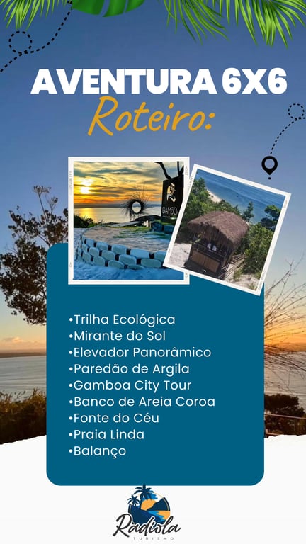 Nossa emocionante jornada tem início na *segunda praia* *de Morro de São Paulo*, *trilhando com destreza os terrenos* *que só um poderoso* *6x6 do exército é capaz de enfrenta*Após a subida no cânion "*O Desafio*", chegaremos em (Área de Preservação Ambiental)*curta trilha até a belíssima "Fonte do Céu*" descida até a praia da Gamboa em nossos *exclusivos elevadores panorâmicos*. Visite o famoso '*Paredão de Argila'*Nos últimos momentos dessa aventura, *navegaremos até "A Coroa"*, *um belíssimo banco de areia*